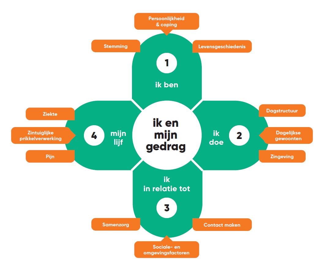 • Ik doe: wat iemand graag doet op een dag. Welke rituelen daarin belangrijk zijn. Wat hem of haar een goed of veilig gevoel geeft.